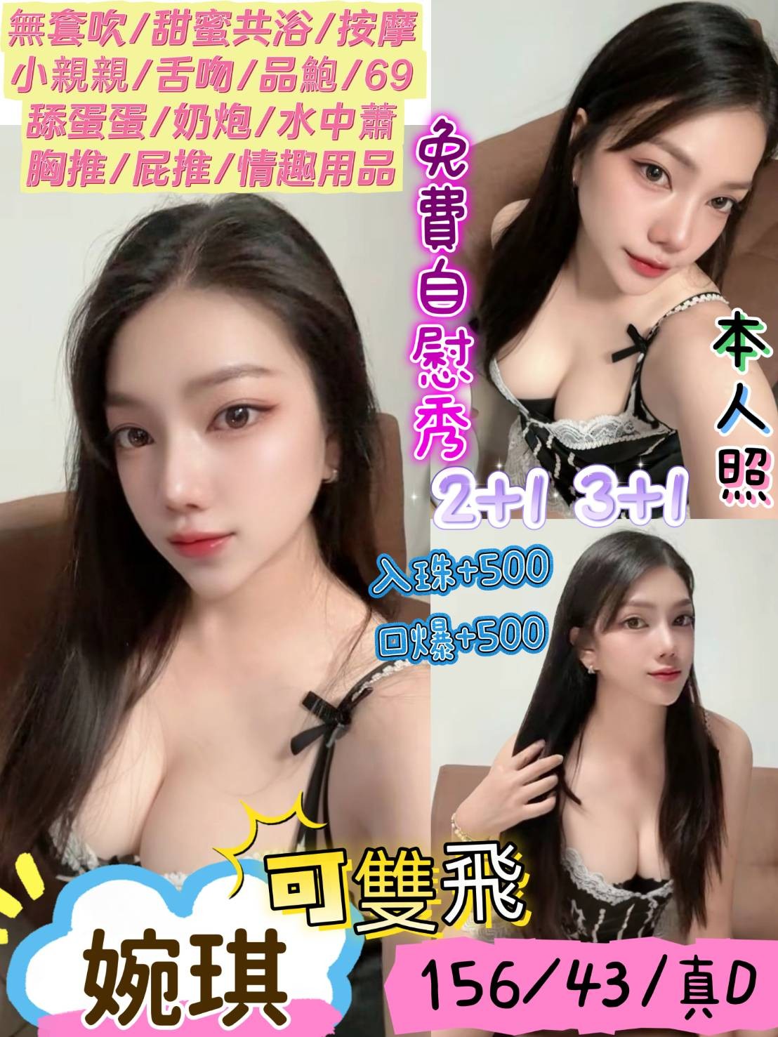 👍項目:無套吹/甜蜜共浴/按摩/角色扮演/親親/69/品鮑/胸推/屁推/奶炮/深喉嚨/水中蕭/舌吻