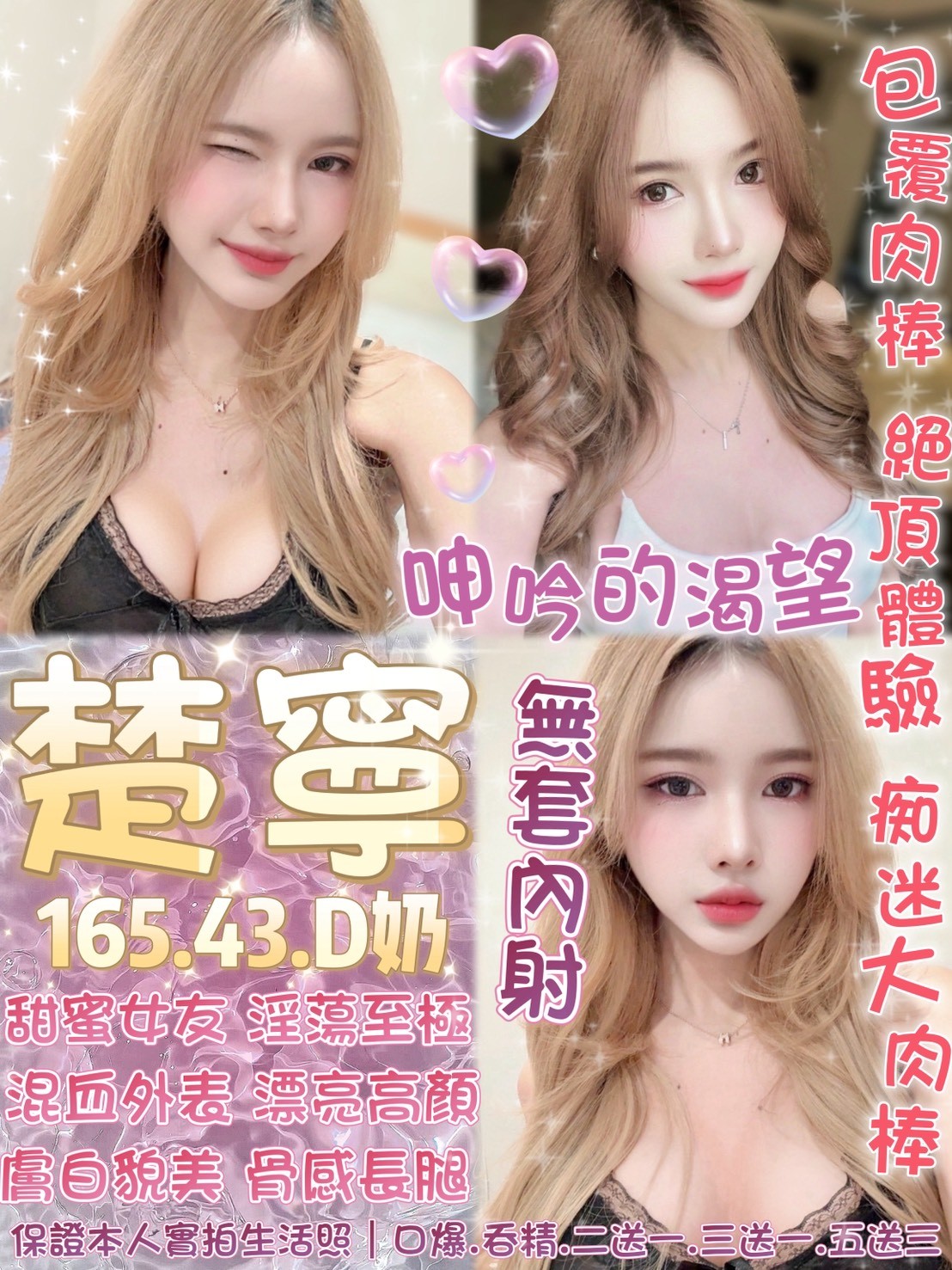 無套吹 共浴 小親親 舌吻視感覺 品鮑 69 深喉嚨 舔蛋 胸磨臉 按摩 奶炮 雙飛 情趣用品(客自備 胸推 屁推 絲襪(客自備 自慰秀
